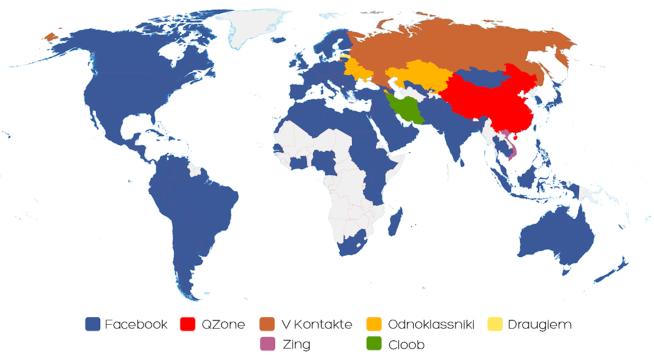 La distribuzione geografica del Faccialibro è però, tutt’altro che omogenea. Il social network è diffuso in maniera capillare soprattutto in Europa, America, Australia e Penisola Arabica; tocca alcune zone del continente africano, ma è poco usato in Asia dove sconta la censura cinese, e in Russia. E proprio in Asia fioriscono infatti, siti di aggregazione alternativi come QZone e VKontakte.